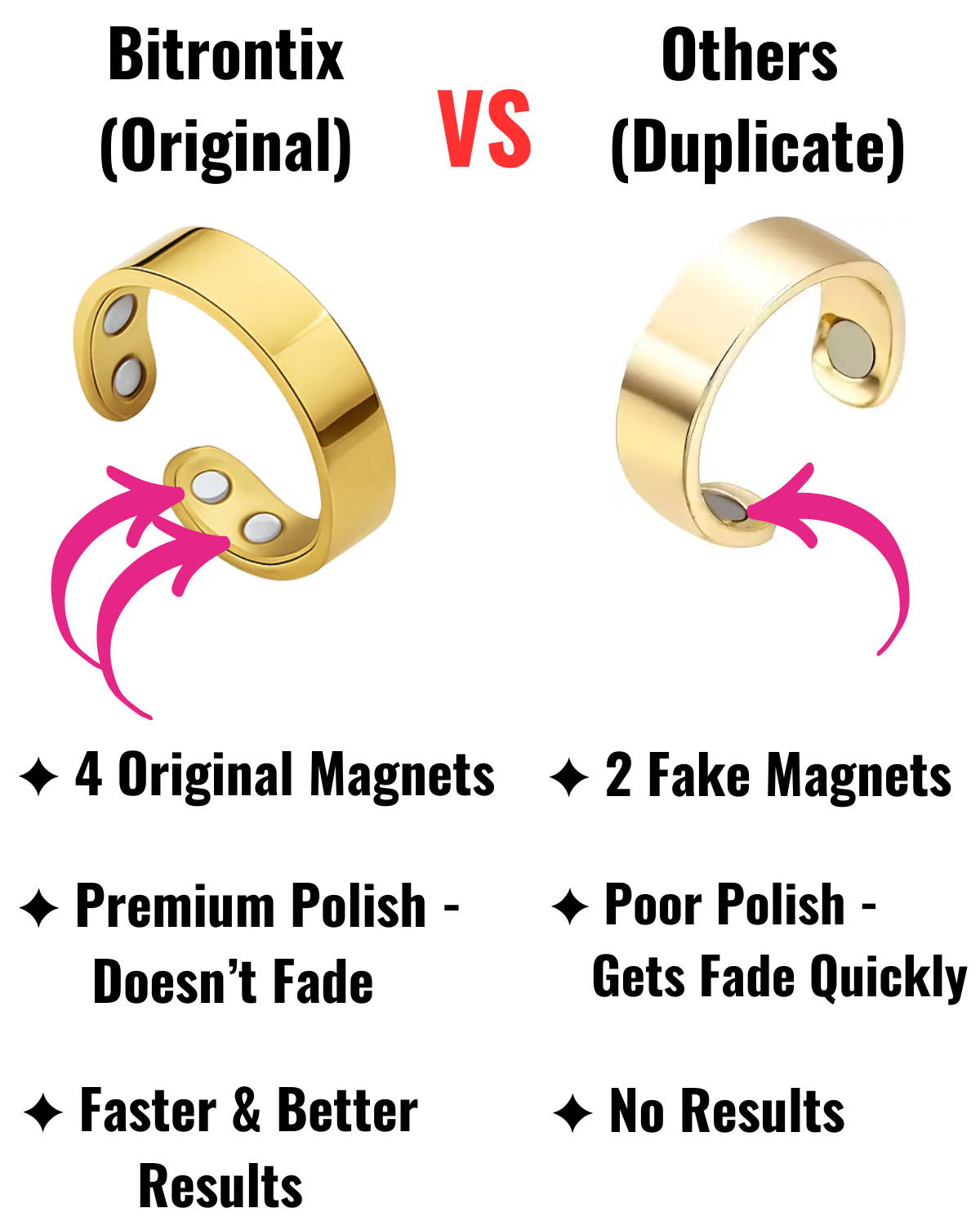 When it comes to your health and results, quality matters. The Bitrontix Original Ring & Bracelet is designed with 4 real therapeutic magnets that deliver maximum benefits, unlike cheap duplicates with only 2 weak fake magnets.